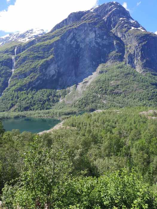 Turen gjekk så tilbake til Olden og neste dal stod for tur – Lodalen. Her var Jens ‘lommekjend’ og fortalde om livet i dalen – ja, til og med song om den prektige naturen og det den har å by på. Dei fleste av oss er kjende med rasa frå Ramnefjellet i 1905 og 1936, som utløyste kjempemessige flodbølgjer i Lovatnet, som feia med seg folk og busetnad i bygdene Nesdal og Bødal. 61 menneskje omkom i 1905 og 73 menneskje i 1936. Me stogga ved minnetavla som er reist, med namna på dei omkomne som ikkje vart funne. Jens hadde mange historiar å fortelja frå desse tragiske hendingane. Bjørg hadde funne ein skulestil (i Allkunne.no) skriven av Anders Bødal, som var den einaste på garden deira som overlevde hendinga i 1936, som 12-åring – ei gripande forteljing.